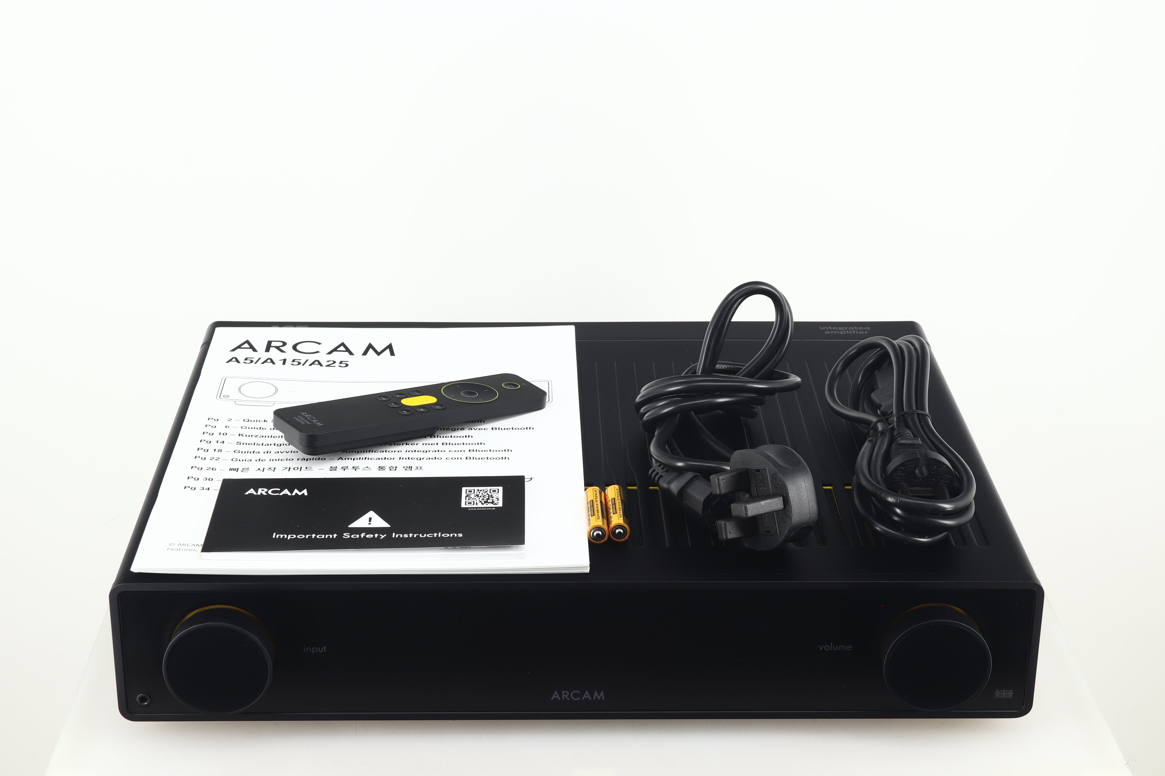 Mains Cable, Schuko Cable, Remote, 2x Batteries, Manual