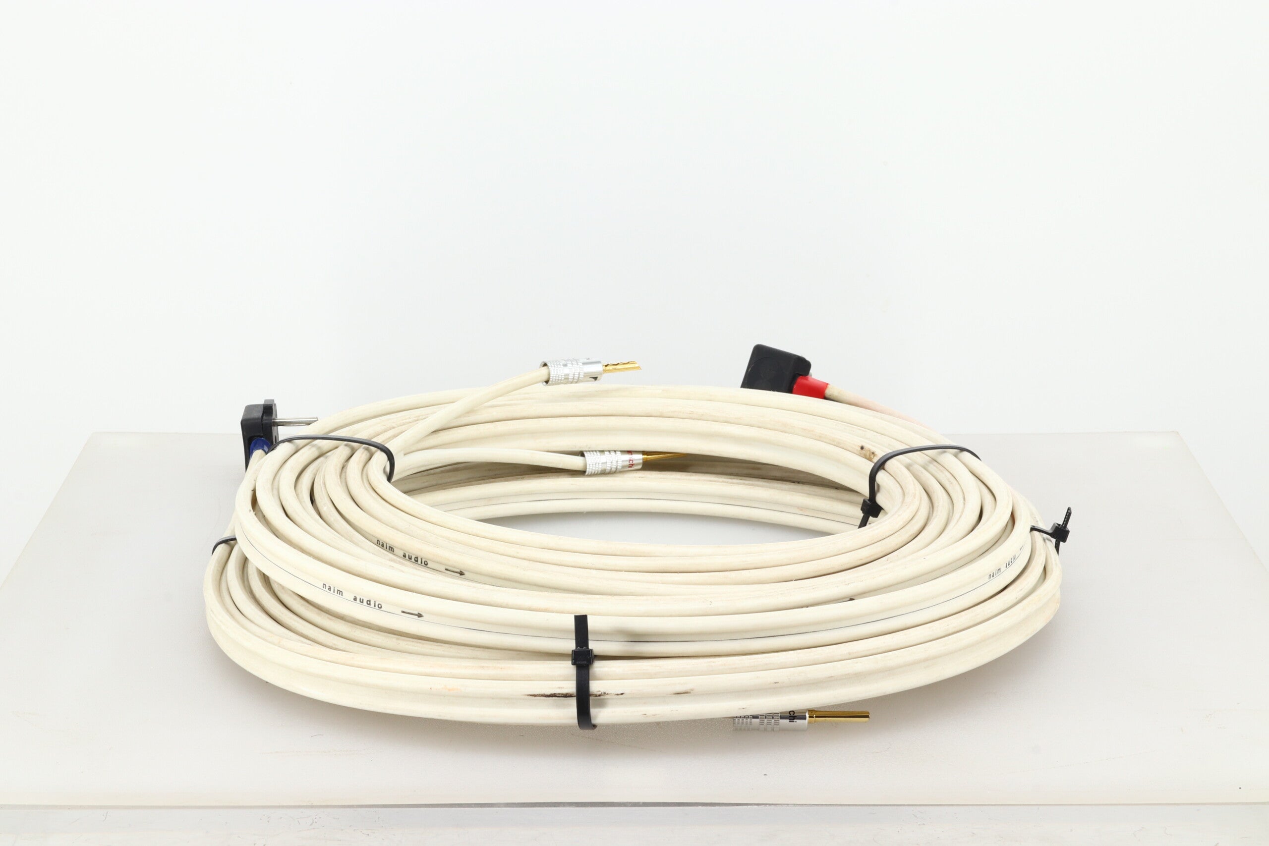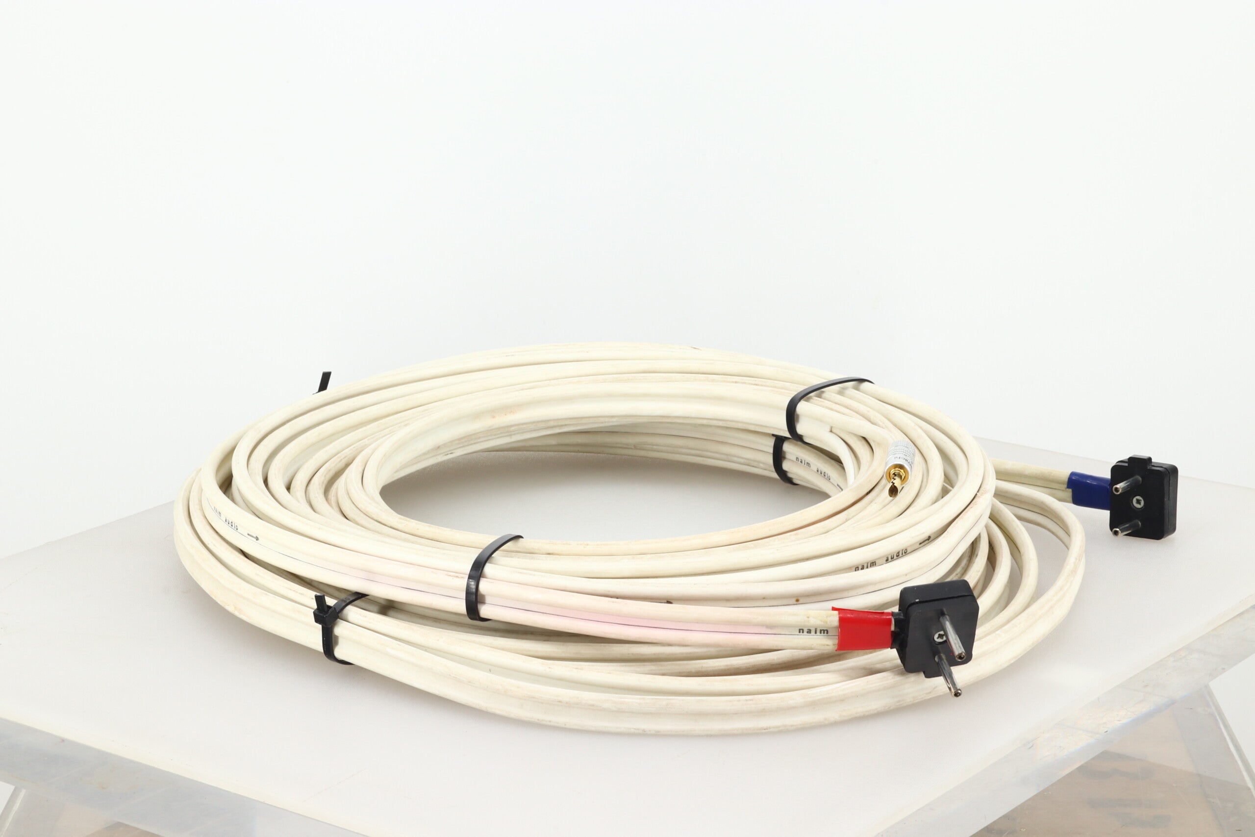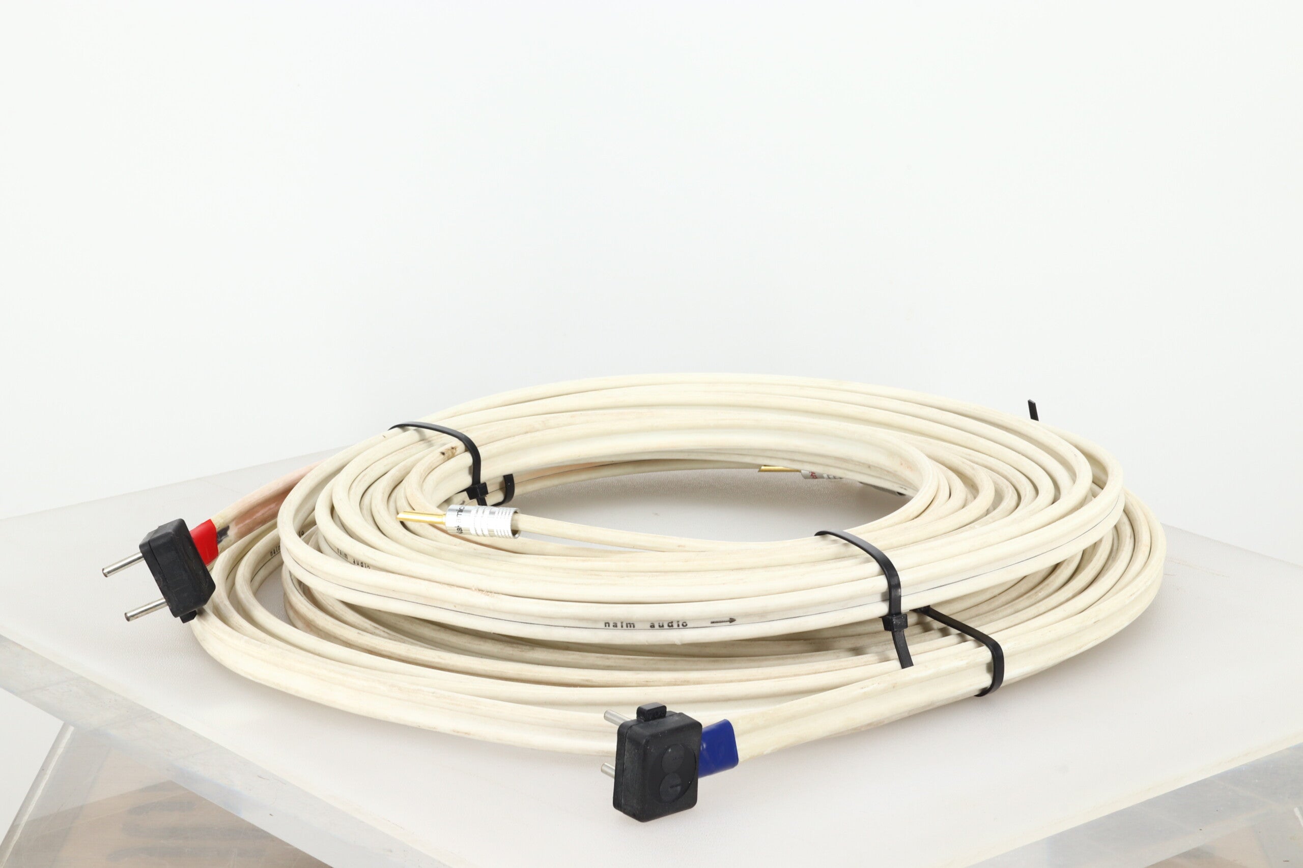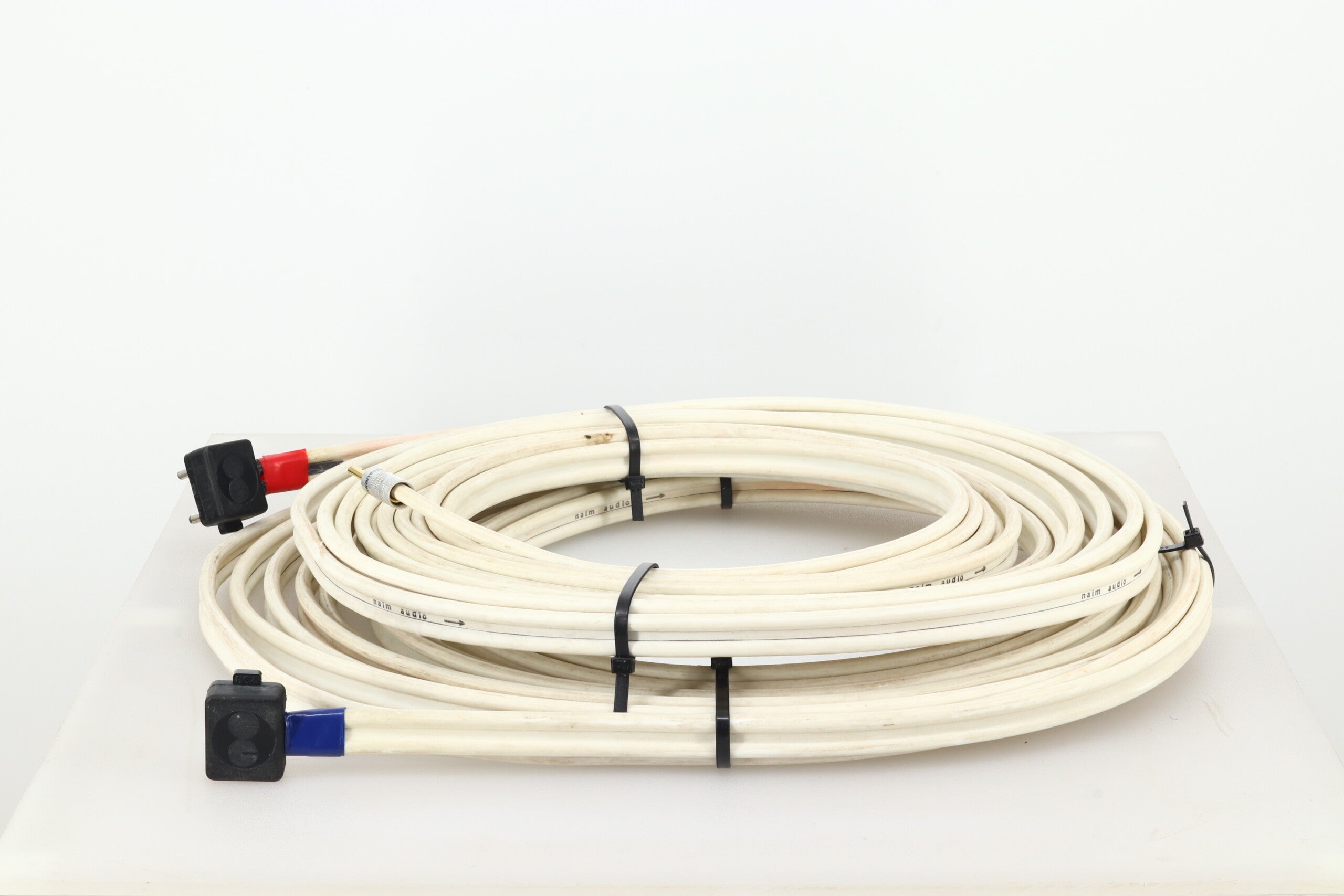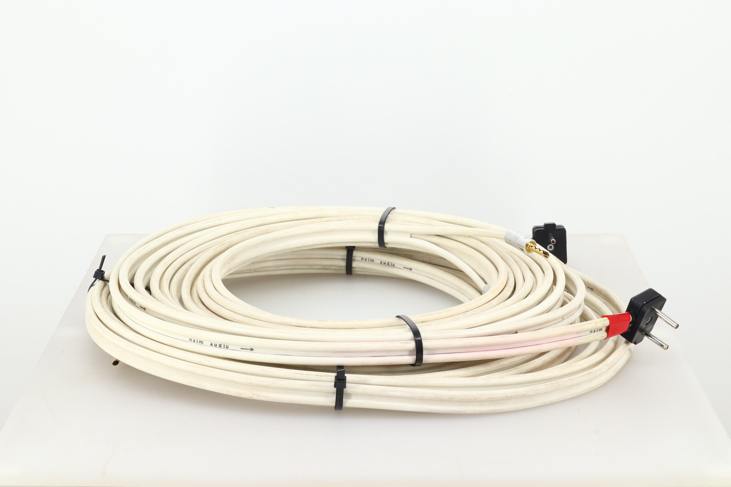 Here we have an 8½ metre pair of Naim’s NACA5 loudspeaker cable that comes in good fully working condition noting some discolouration of the outer jacket. Terminated with NAIM speaker plugs (amp ends) and 4mm plugs at the speaker ends.