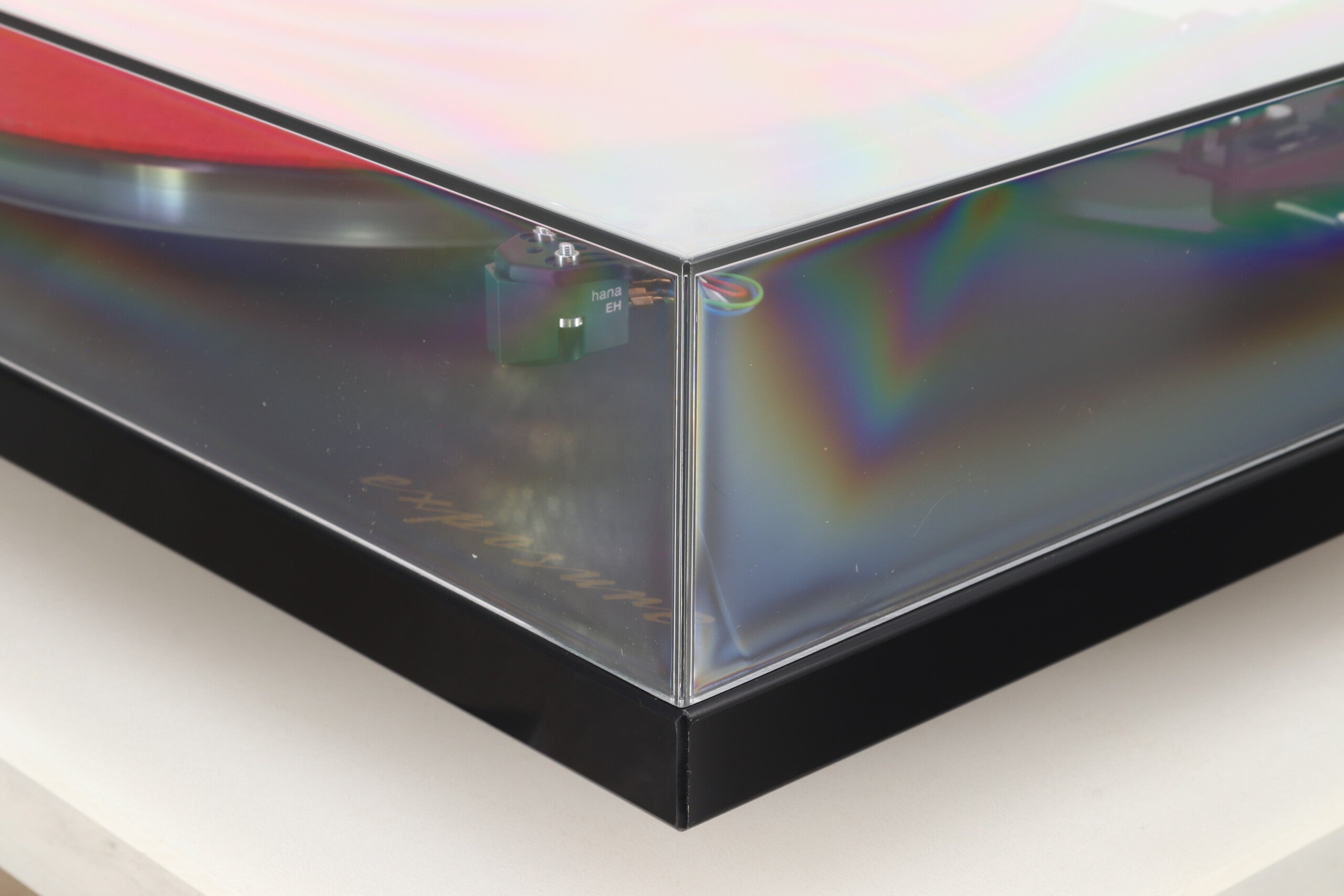 The turntable is built around a super lightweight plinth, in which a core of polyurethane foam (a material developed for the aerospace industry) is sandwiched between an extremely thin and rigid high-pressure laminate.