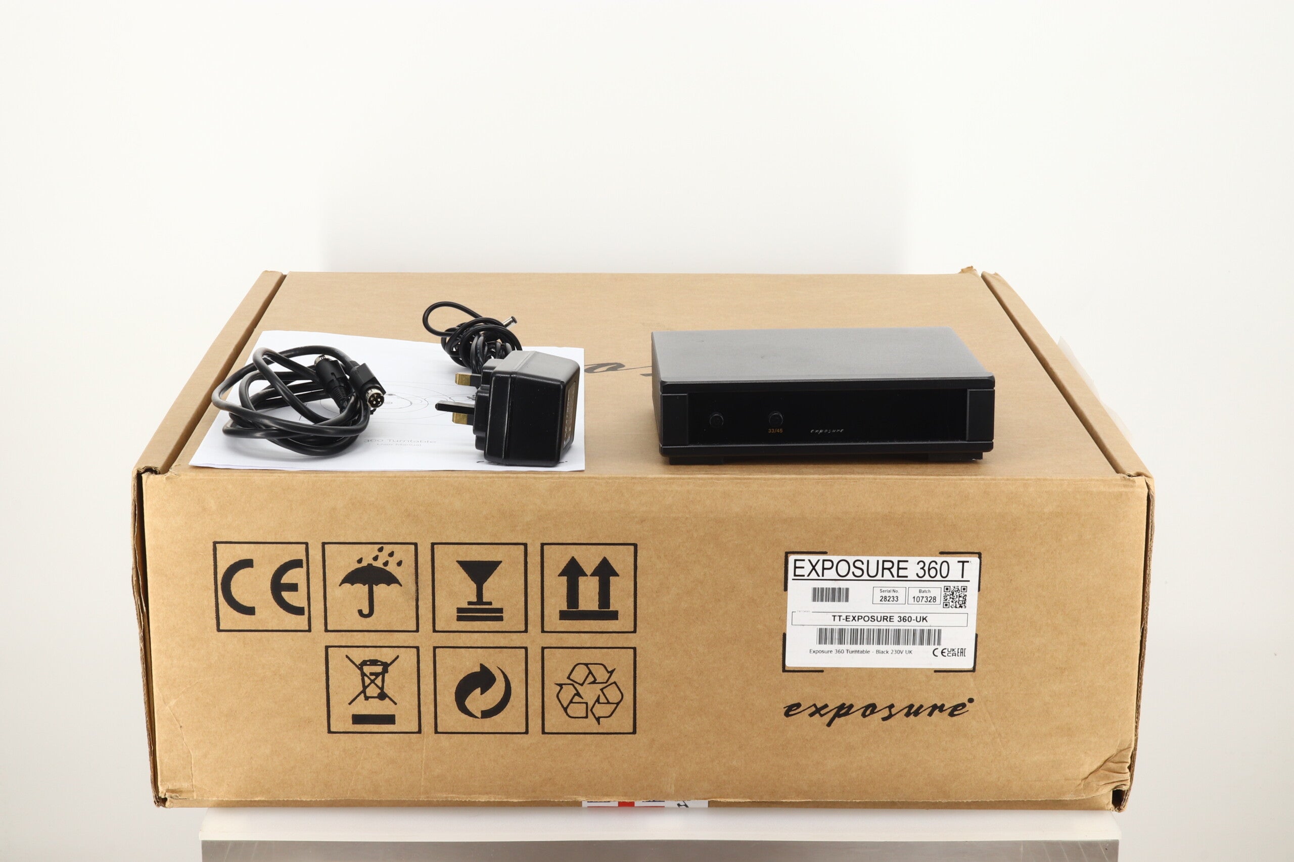 Here we have an example of British company Exposure Electronics very first turntable. The 360 as it is called has been produced with the aid of a certain other British turntable manufacturer, the identity of which is rather easy to distinguish, and to all intents and purposes appears to be a rebadged P6. The main difference between the two is that as standard no cartridge is fitted to the deck although our unit comes with a Hana EH high-output moving coil cartridge. The package comes in very good condition noting a couple of very minor blemishes, and is supplied in original factory packaging along with power supply unit, PSU cable, DIN cable and manual. This all comes with our standard warranty, but please note this does not cover the fitted cartridge.