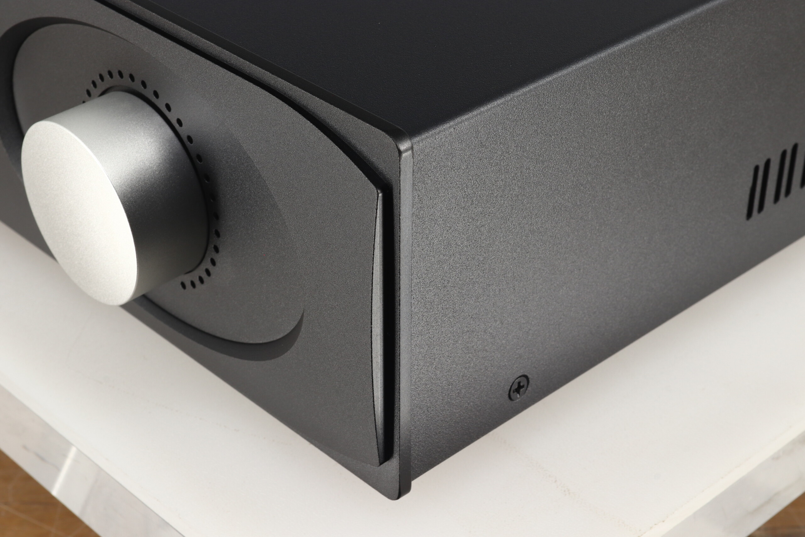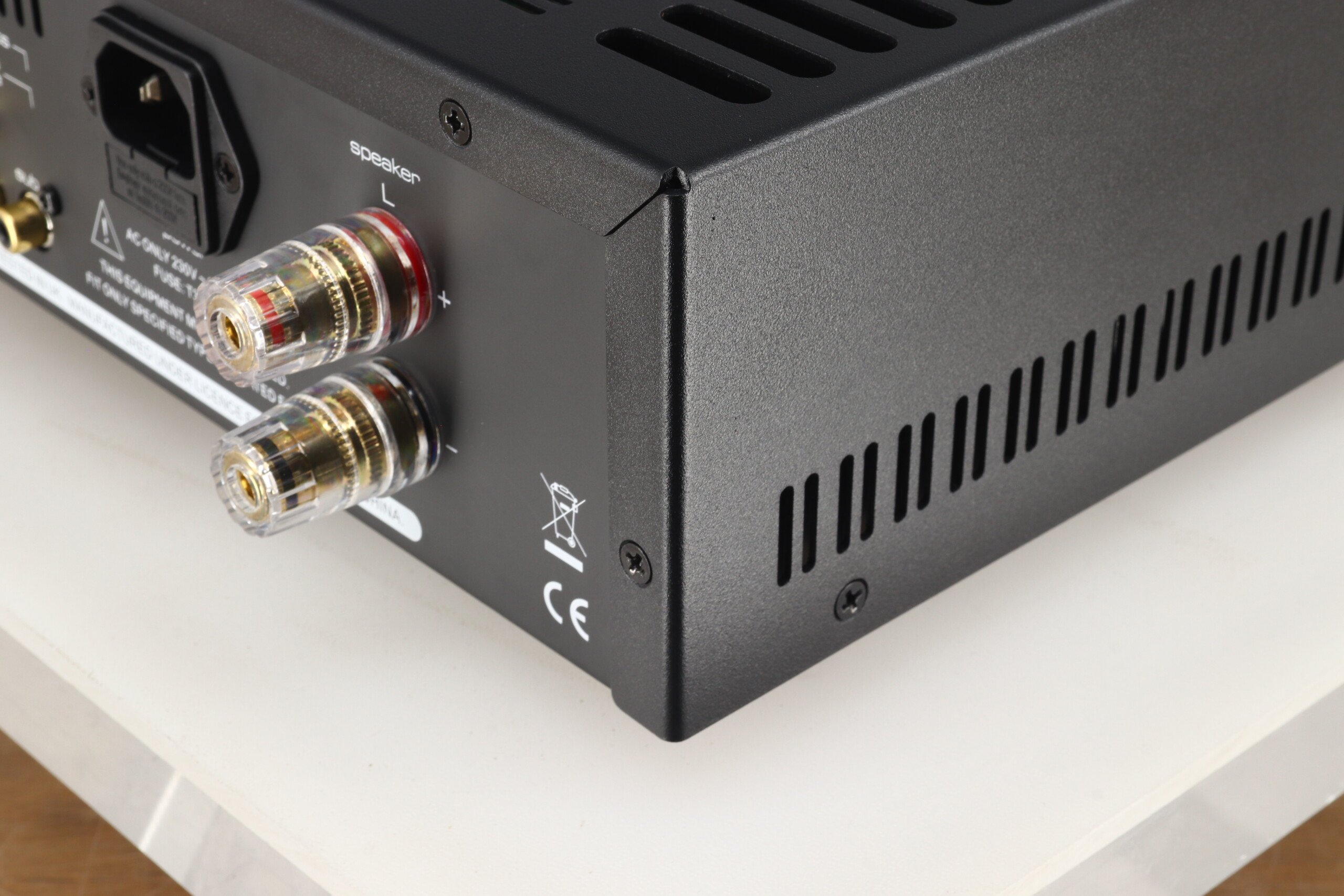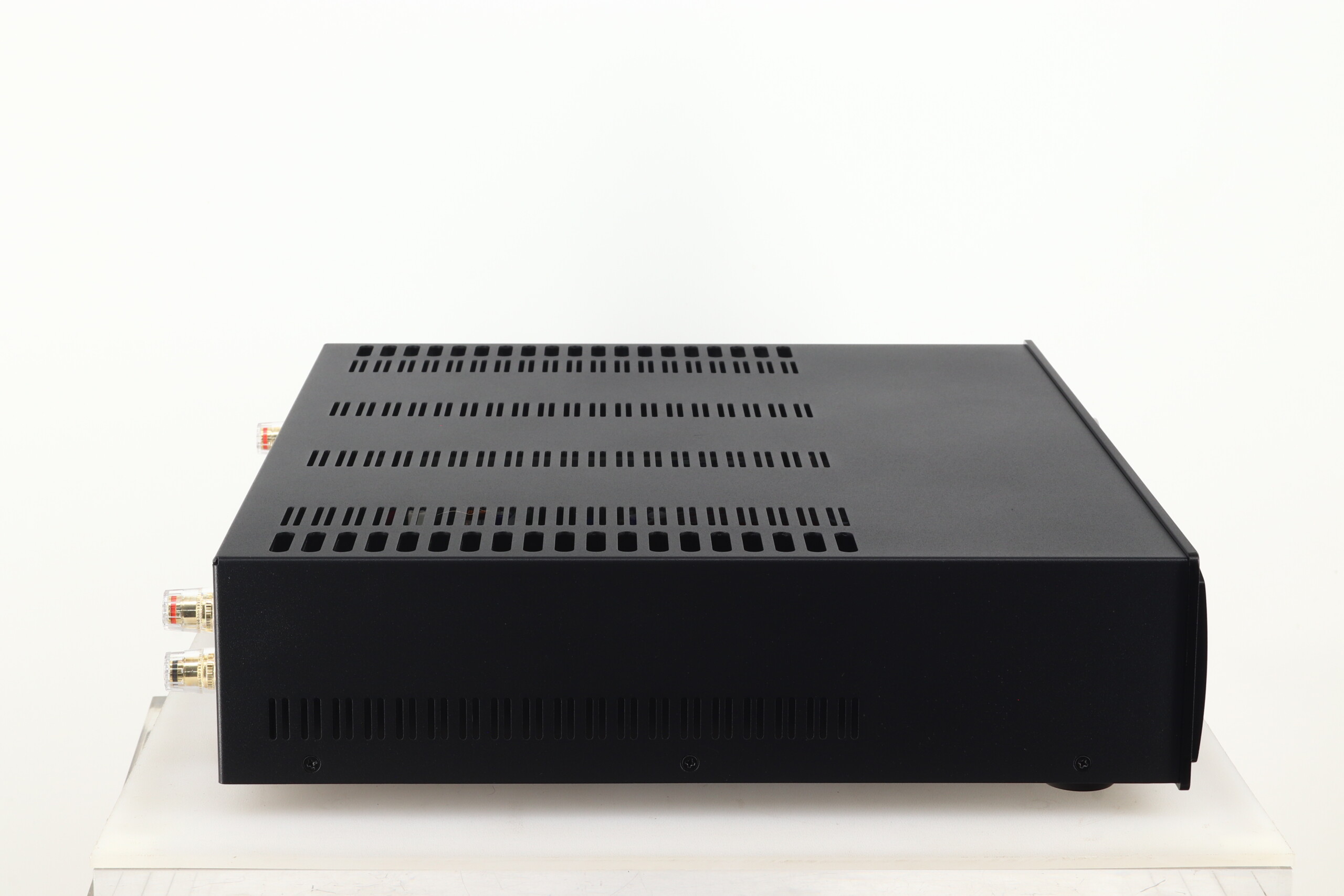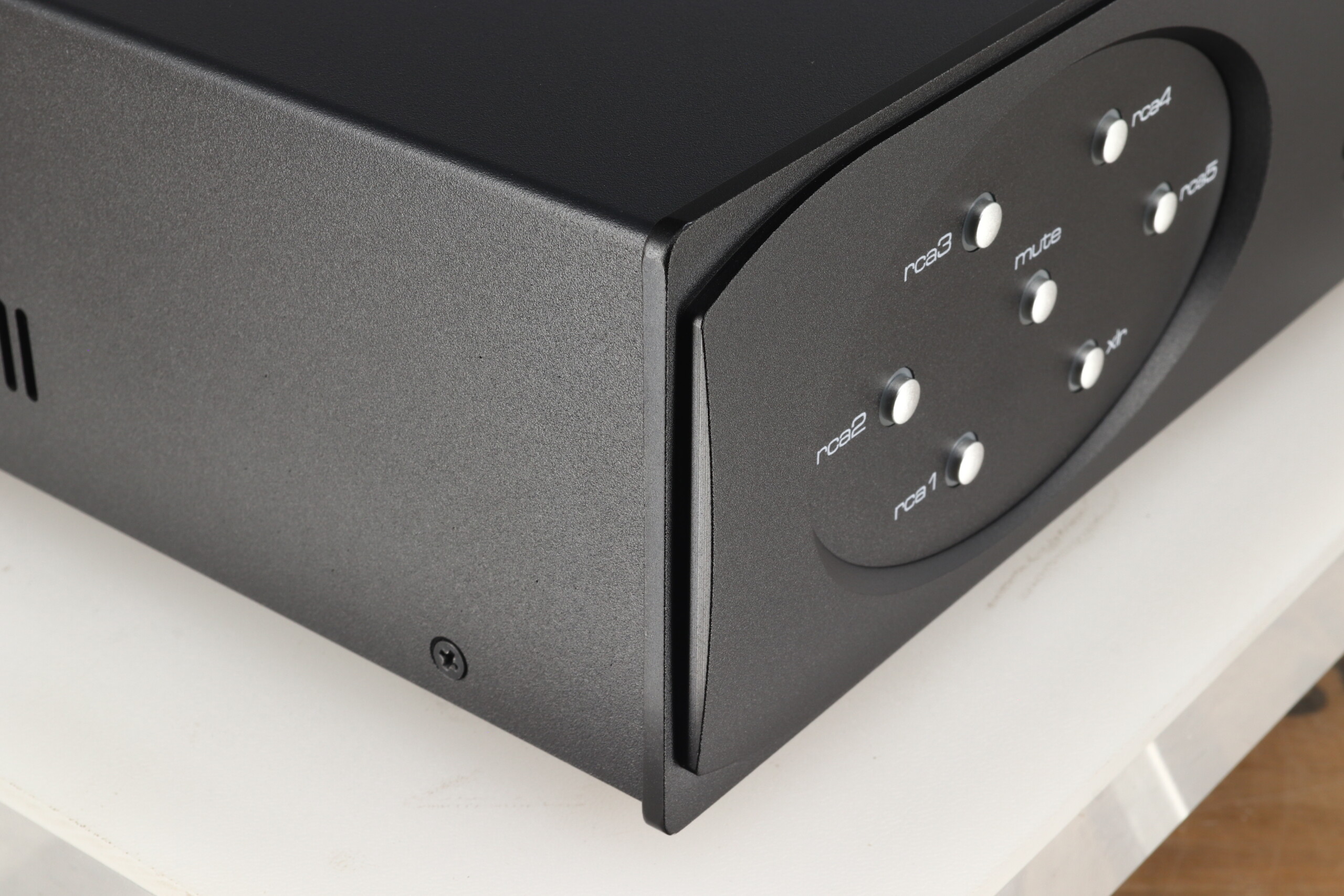 Inside, there is a large transformer and power supply, feeding boards populated with audiophile quality components, all housed in ventilated casework with a distinctive aluminium front fascia design, available in three standard anodised finishes, silver black and red.