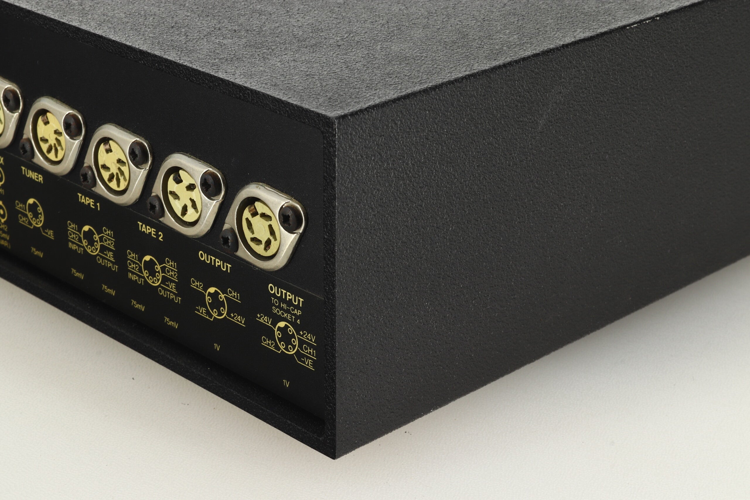 Internally the NAC 32.5 consists of a mother board with eleven daughter boards interconnected with gold-plated precision connectors. Both the NAC 62 and the NAC 32.5 have BNC sockets for interconnection with pick-up cartridges and locking DIN sockets for all other connections. Special circuitry delays output to the amplifier until normal operating conditions are reached after turn-on. Power is supplied from a regulated supply in the NAP 90, 140, or SNAPS via a SNAIC-4 interconnect, or, with improved performance, from a HiCap power supply via a SNAIC-5. Use of a remote supply ensures hum-free operation and enables correct earthing to be used.