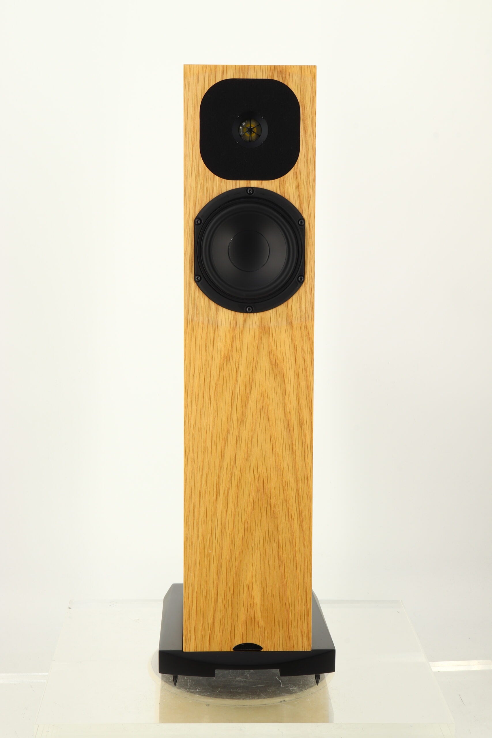 This loudspeaker uses a two-way configuration, with the bass/midrange driver and the tweeter operating within separate spaces. The bass reflex port is fitted to the bottom panel of the cabinet and is vented through an outlet in the stylishly sculpted MDF plinth.